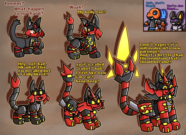 A comic Im drawing based on a concept by the incredible Ryusuta , where living creatures get turned into androids. I put my own twist on the idea. The idea is that Team Rocket has captured me for an evil experiment, called "Mecha Evolution". They intend to make pokemon evolve in a more unconventional way, by turning them into android pokemon. My jet pack makes me fly faster than any other Charizard. My plasma is hotter than regular fire. My titanium armor deflects any attack. I am the perfect weapon, and Ive been brain washed to obey Team Rocket.Related content