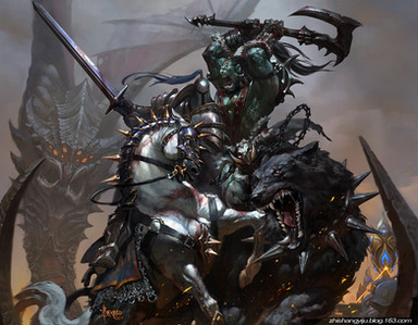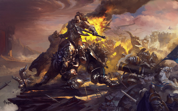 As in, Arthas' horse? There's a guy in vaguely Stormwind-esque armor, with flowing white hair, fighting orcs. Should I at least assume this is inspired by Blizzard works?
