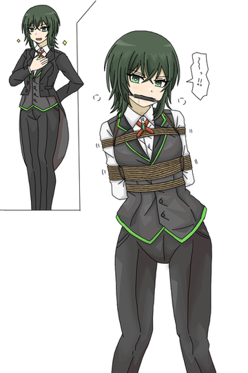 Lombriz was captured and tied up again. She tried escaping ropes which bind her, but she couldn't untie as usual. However, she doesn't dislike being bound and struggling. In fact, she is said that she's usually tied up for the reason that it's rope escape training.Related content