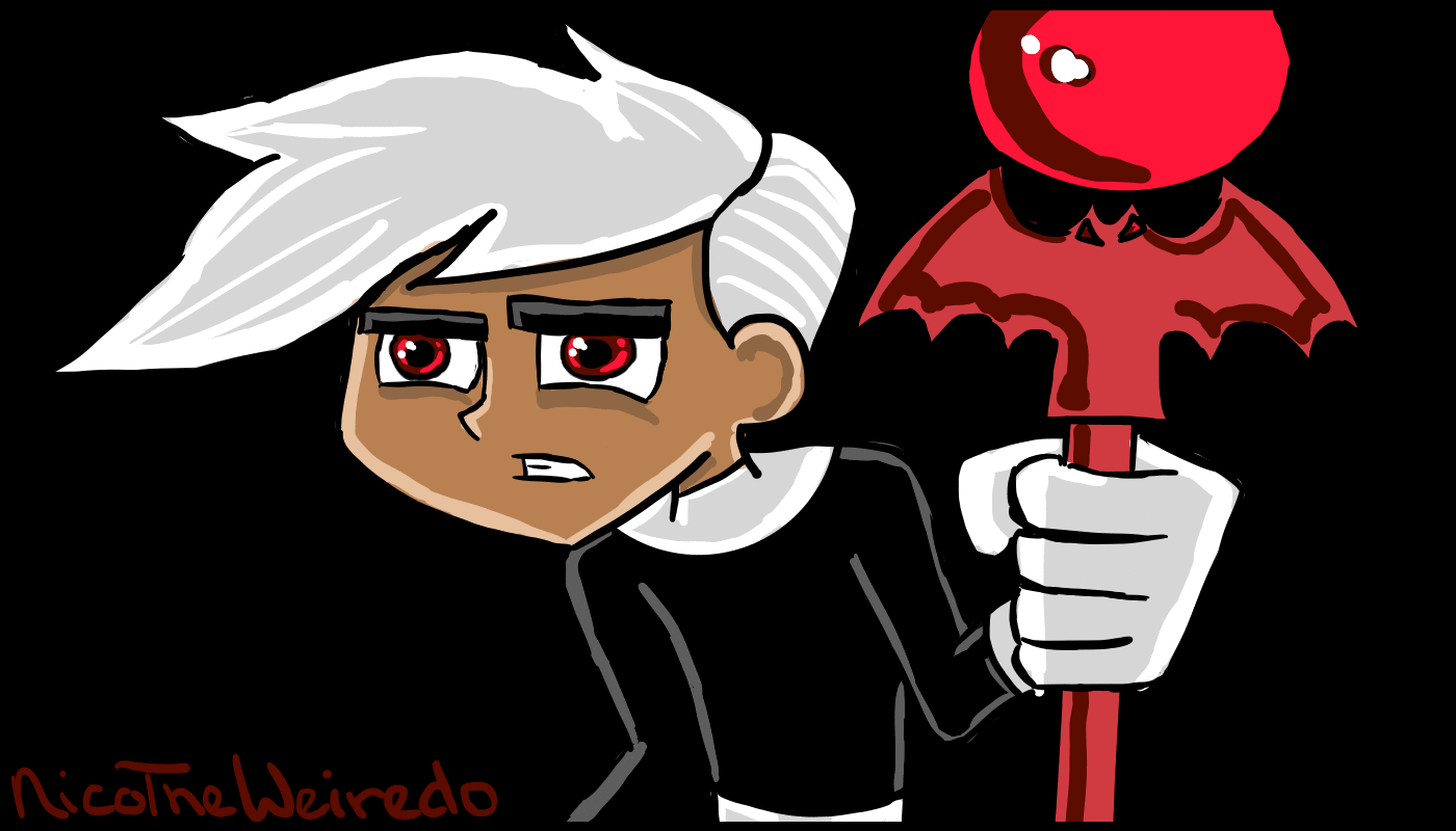 Got that from a screenshot of "Control Freaks", it's Danny been hypnotized to the Dark Side by Freakshow. Don't confuse that with Dark Danny from "The Ultimate Enemy". There is another one going to come, which also comes from "Control Freaks" but I got something different than normal coming right up. Nope, it's not Danny got his logo on his shirt, it's something else.And also notice that the background is different compare to the original screenshot, because I eliminated the pylon cables. This one is done by Illustrator, and it's quite frustrating to trace them unless I use Photoshop. But in that case, I didn't.