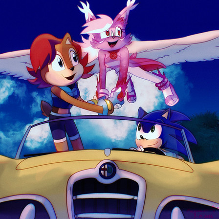 I love the fact that Sonic isn't actually in the car with his friends, and is instead running along side it. Of course he'd probably have more fun running beside his friends! Nice work!