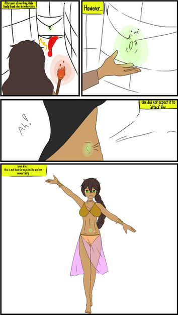 the idea for this one came from a convo i had with boomerang96. turns out not all scarabs got taken out, its nothing to worry about though as this one just sleeps inside her stomach most of the time, unless its bored of course, then it takes over to dance their boredom awayshe has no memory of the possessions so she just ends up confused wondering why everyone's staring at her...