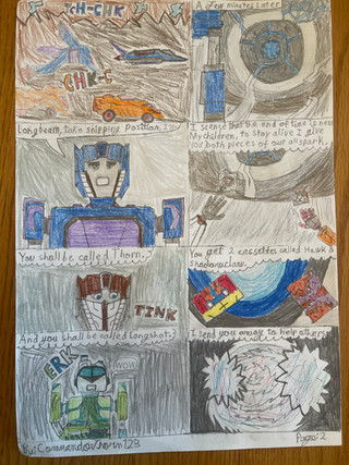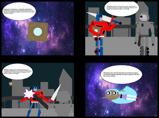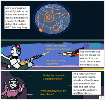 Here's the first page of my Transformers comic. It takes place on Cybertron after the Quintesson Invasion and the Civil War between the Autobots and Decepticons.The comic is made with Paint, Paint 3D and 602 Text program.