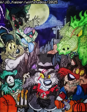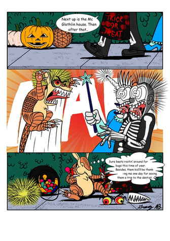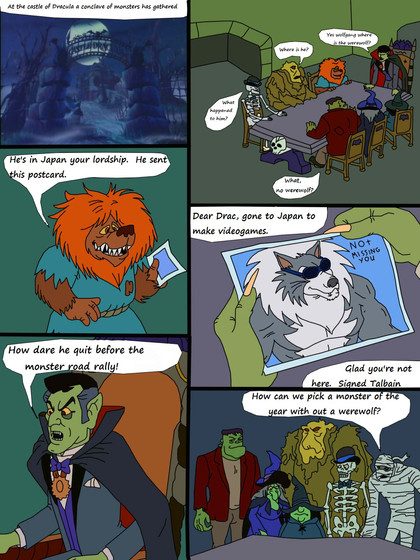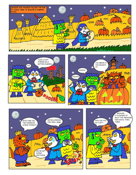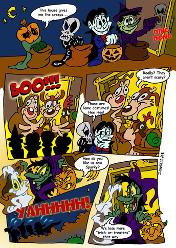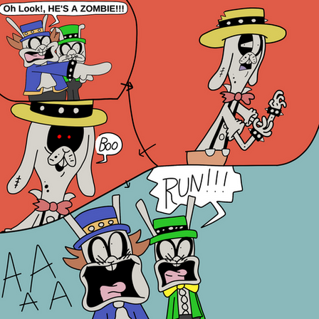 Drackie, Frankie, Wolfie and Mummie are scared off by a ghost.The mask and "Ooga Boog Booga" are homage to Eustace from Courage the Cowardly Dog.