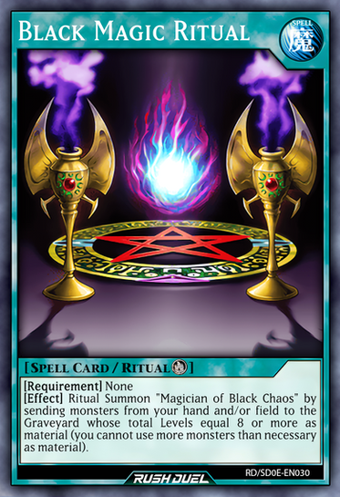 Ritual Spell CardLore: This card can be used to Ritual Summon any Level 7 or 8 Spellcaster Ritual Monster from your hand or GY. You must also Tribute monsters from your hand, and/or banish 1 "Enchantress of Chaos" or "Enchantress of Black Magic" from your field and/or Deck, whose total Levels equal or exceed the Level of the Ritual Monster you Ritual Summon. You can banish this card from your GY; Fusion Summon 1 "Chaos Scepter Magician" from your Extra Deck, by banishing Fusion Materials listed on it from your GY. You can only activate 1 "Chaotic Dark Magic Ritual" per turn.