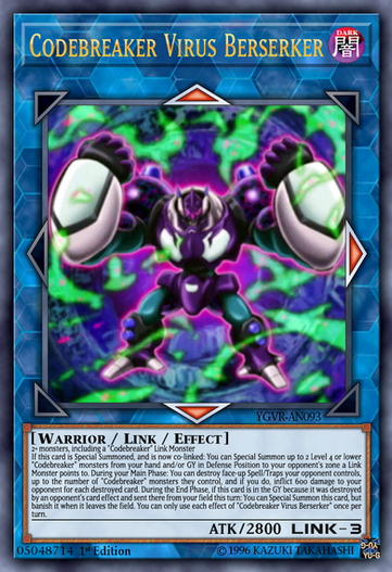 Lore: If you would use a Cyberse monster(s) you control as Link Material for the Link Summon of a "Code Talker" monster, this card in your hand can be used as a Link Material. If this card is sent to the GY as Link Material for the Link Summon of a "Code Talker" monster: You can Special Summon 1 "Code" Cyberse monster from your Deck, except "Code Retainer". If this card was used as material from the field, you can Special Summon 1 Cyberse monster with 2300 or less ATK from your Extra Deck instead, except a Link Monster. You can only use each effect of "Code Retainer" once per turn.