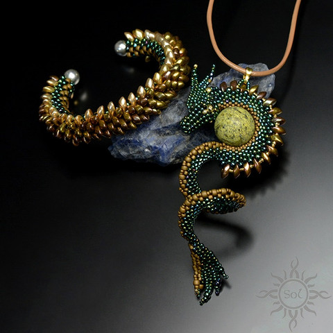 I think that the netted pearls going into the herringbone is a really interesting combination. I also love that spiral clasp, and the pendant made with that butterfly bail and a ring of beads. But then I really like your work!