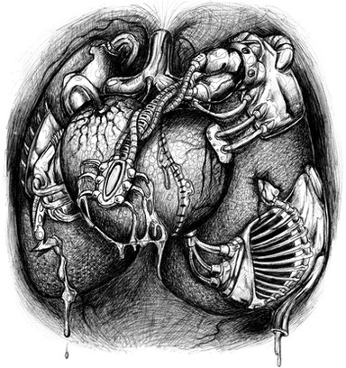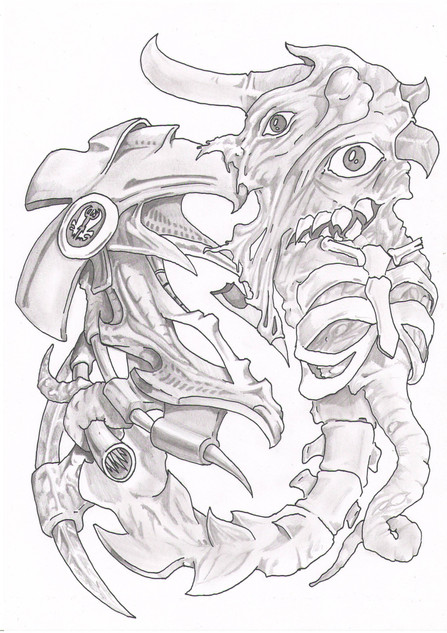 Here is another "incomplete" but "finished" piece. I will eventually get to digitally painting this at some point. I would have painted it with watercolour but I didn't want to risk ruining the original. Perhaps if I can find a way to get ultra high resolution photocopying onto watercolour paper I'll attempt it, but until then, enjoy this for what it is, complete abstract surrealistic where I had no set goal other to than to create something a bit weird and strange(bit of gigerism and tattoo idea in there)