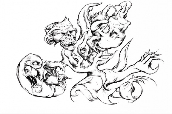 This piece is great. Nice flow and easy on the eyes. Good contrast and I love the non-traditional skull "tattoo" feel of it. However, I feel that the 8 ball pulls in the cheese factor a bit. Everything about this piece screams unique...except for that 8 ball. My opinion is to leave it empty if nothing else fits. The flowers are a nice touch as it appeals to someone like me; I love the dark, masculine appearance, but the flowers help balance it with a minor feminine touch. The hard, dark vines really help add some depth to the piece overall.
