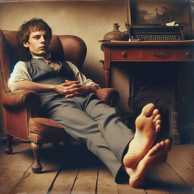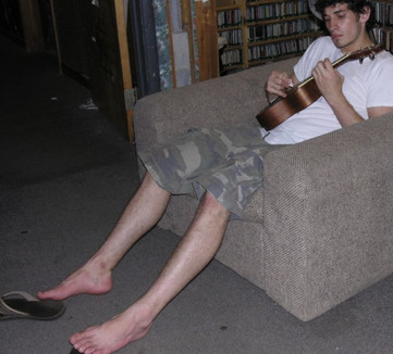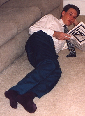 This is over a year old, but it was brought to my attention that I should upload it. Taken in my parents alternate dining room/family room with their camera in a suit I got from a thrift store. I had no socks or shoes that went with the suit, so I went barefoot. Look how huge that foot is! I get a lot of Harold (from "Harold and Maude") comparisons when people see this picture.Related content