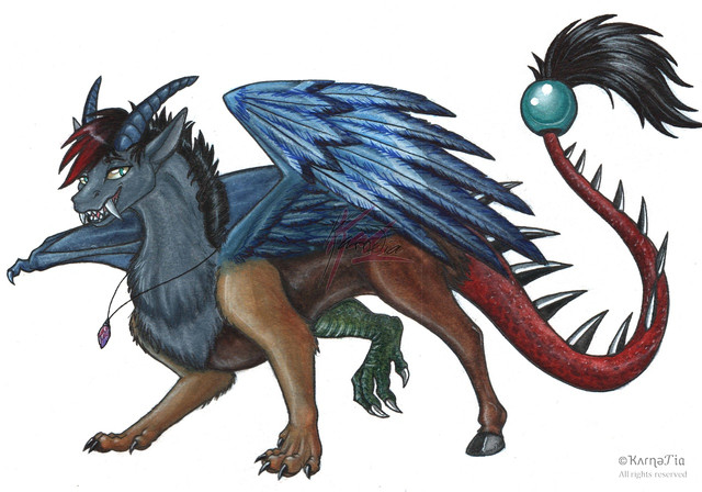 wow. those wings are just beautiful, i love her expression, and the horns, and the awesome paws and back legs. AND THAT TAIL JUST PWNS XD those snakes are the shitz. X3 i love their awesome tounges. Beautiful detail in the shading, and the muscle, and just everything. :3 i love this. i hope i can draw it soon. <33