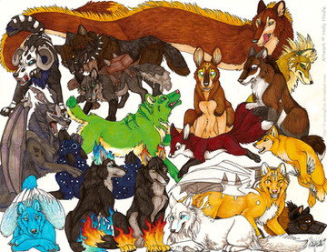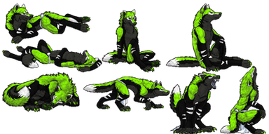 What I did here was make a template for Male, Female, Female cub and Male cub, left the green parts blank. (This is a good size comparison for all of them! Note how the males are smaller) The blacks and greys are all copic marker and prismacolor pencil colored. Once there I scanned them and customised them to each person's design adding scars and their own unique green.