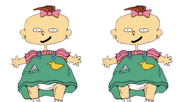 Phil and Lil DeVille are a pair of fraternal twins featured in Rugrats. They often play around with Tommy and the other Rugrats. Lil and her brother Phil are twins who are alike in almost every way possible. Usually dressed to match, they both wear pink with black-pinstripe shirts and turquoise outfits (Phil's being a shirt and Lil's being a dress) with a handkerchief on the left side and a duck on the right, and both had a small amount of brown hair on top of their oddly-shaped heads. Lil wore pink shoes, a pink bow on her hair and no shorts (exposing her diaper like Tommy Pickles), and was always drawn with ear lobes. Lil is older than Phil by two minutes.