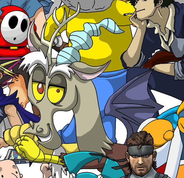 A collage of familiar faces and internet icons that a majority of the members of this sits can name and say where they come from. The coloring of each of the characters appear to be original. From I can tell this took time effort and devotion that you cant find in anyone whom hated his or her childhood. Some of these characters are from before my time. However there are some characters such as the Mane 6 and the creeper that I am knowledgeable in. All in all I can just look at this and just look back at my childhood. Good job buddy!!!