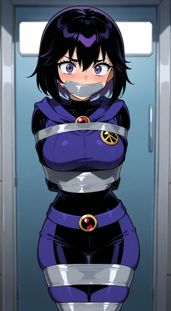 #leather #ai #bound #cartoon #raven #straitjacket #teentitans #raventeentitans #straitjacketbondage #ballgaggedgirl #aiartwork