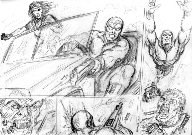 this was my submission to AC Comics in the early 1990s, featuring their signature team, Femforce...Composed mostly of characters derived from Golden Age characters whose rights have lapsed into the public domain, the three depicted in panel one, left to right, are: