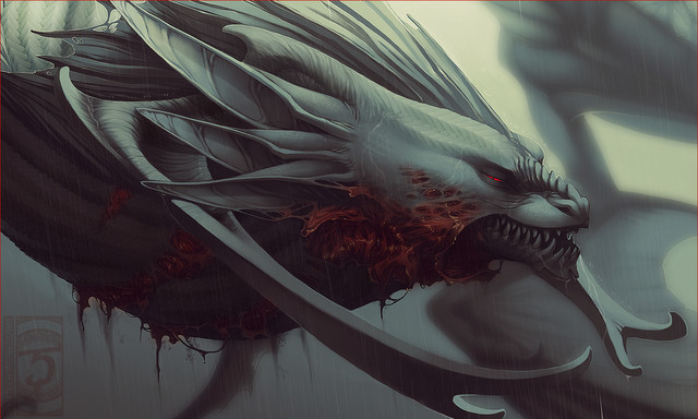 Amazing work. The clouds certainly add a whole lot to the artwork. And the slight reflection of the flames on his/her/its neck giving it a slight orange tint is very nice ^^