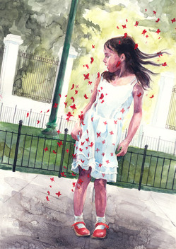 wonderful!!! much like your other piece i have yet to comment on with the boy reading the book and the butterflies!! i love the tall skinny composition. its wonderful to start at the top and scroll down to see the origins of the emmerging flowers... its so interesting also that you seem to have incorporated text into the red petals--as if reminding us again that theyve come from the book. the girl is sweet--i like her simplicity and softness. well done!