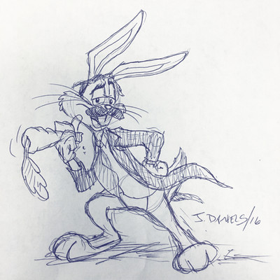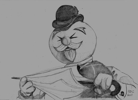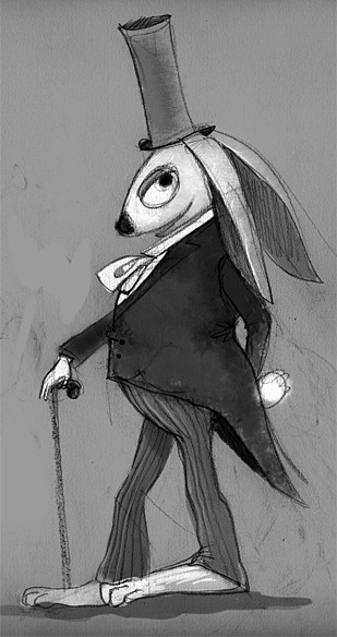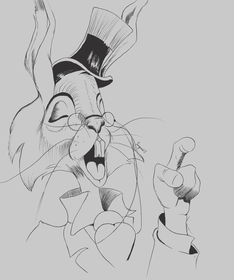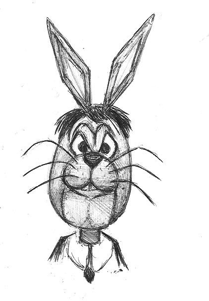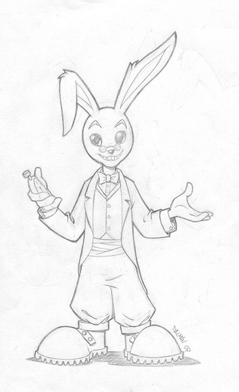 A more elaborate portrait of January Q. Irontail, April Valley's resident tyrant and dictator.Irontail strikes a familiar pose on the balcony of his new residence while he addresses the crowd below. Among his numerous changes: eggs shall be dyed the shade of mud and new concrete. No more chicks and bunnies. Now it's tarantulas and octopuses (sic). And forget Easter bonnets. From now on, only Easter galoshes.
