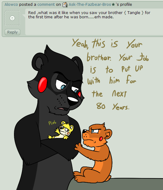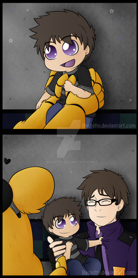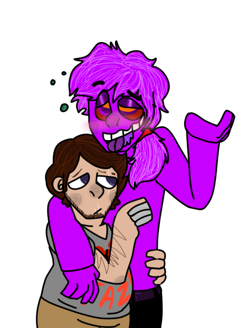 A birthday gift for of their OC, James, with Springtrap~This isn't done. ;w; I wanted to add a background, but I am super pressed on time. I am so sorry! Obviously..James is high. lol Springtrap is now Trixtrap. I couldn't make him very 'phantom' looking quite yet. I hope this is ok. ;w; Trixtrap is oddly cute. And I want to mega hug-squeeze James. ;w; <3 A-Anyway...sorry this isn't super good. B-But I hope you have an awesome birthday. ;w; <3 Β Β
