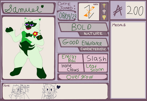 The only times Sam really seems to be "himself" is when he is around his brothers, and more of the excited Nuzleaf starting in the market for the first time comes out. With a sharp tongue and a love of pranks Sam can be a menace when he wants to be and his terrorizing of his siblings is matched only by his passion for his hobbies. Art, cooking, writing, crafting, anything that allows him to show off his creativity he'll pick up eventually, though not every attempt sticks. Even if Sam feels, unjustifiably, indebted to his siblings for taking care of him Sam still feels the safest and happiest around his adopted siblings. Everything he does he does to make them proud, though he hasn't yet realized they have been and will always be proud no matter what.