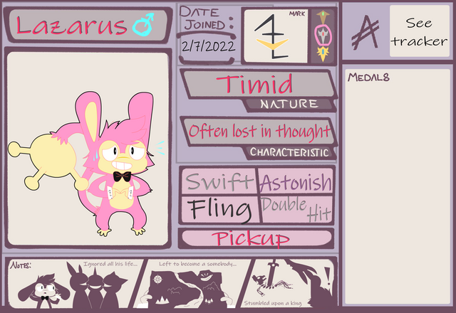 ☎ Personality: Sam is desperate to say the least, his oozes the energy of someone who will do anything and everything to achieve their goals, and a philosophy he used to subscribe to until recently. Hiding behind the façade of an overly enthusiastic salesmon is a very insecure and uncertain pokemon, no where near as confident as he tries to appear and barely managing to do that in the first place. He is heavily driven by his emotions and easy to get going, almost erratic even, something that doesn't usually help with perspective customers. But even that energy is quick to fade, occasionally coming off as rather mellow and quiet--when he gives up trying to keep the mask on. Despite being a defeatist in denial he is still very sweet and has been making a conscious effort to be more friendly and welcoming to other pokemon while not also caking on the salesmon persona.