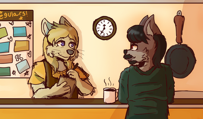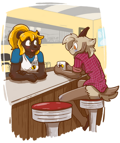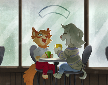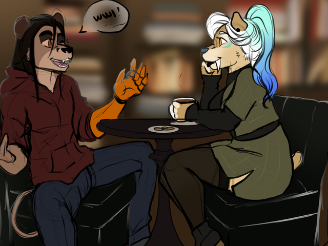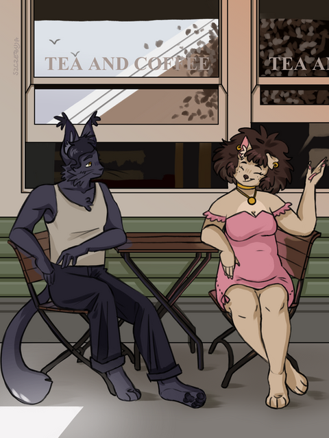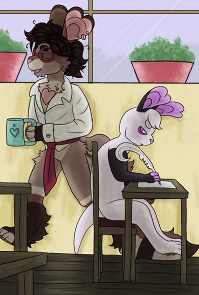 An Autumn commission for @/doggirlhen of pups characters Sydney (she/they) and Lilac (she/it)! I love drawing little scenes like this, so cozyRelated content