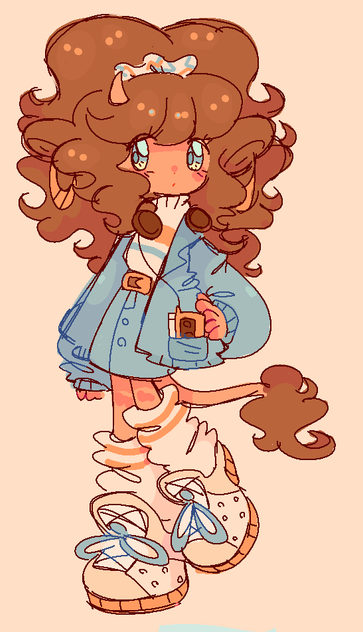 An adopt i got from @/MochiMo-Kun uwu[Image description: a sketch of an anthro mouse girl with brown fur. She has a large pale blue sweater/dress and knee-high white socks. She has short brown hair and has bell earrings. She doesn't have a tail.]