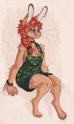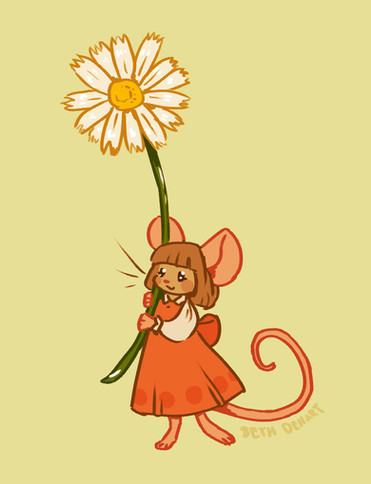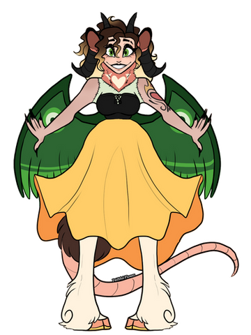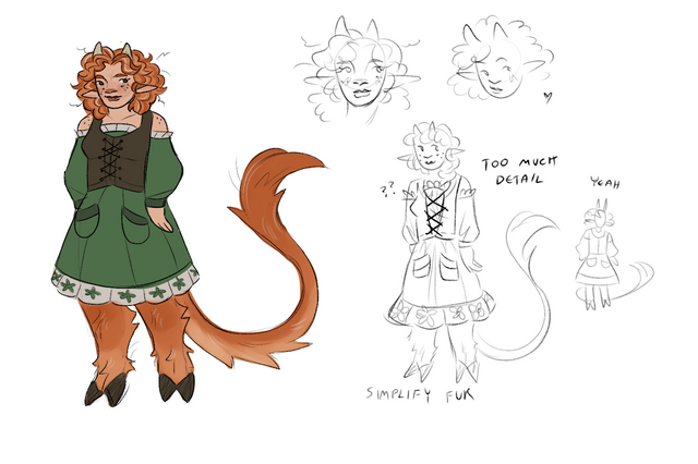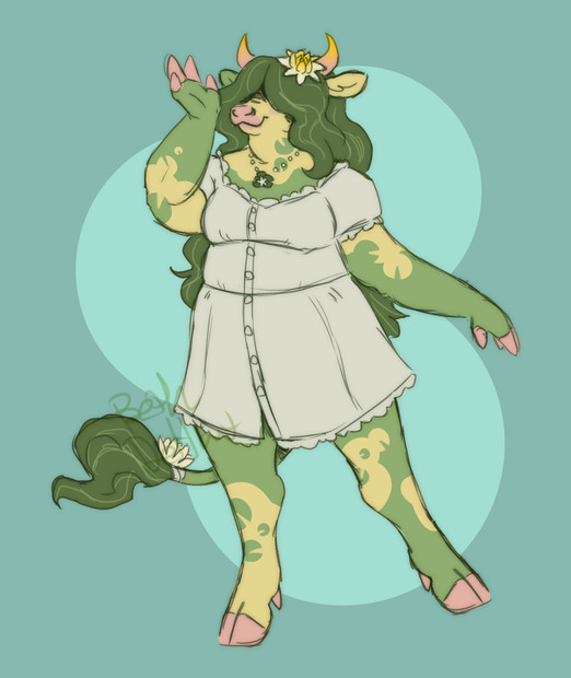 (uses he/him pronouns) I love Brie sm!! He loves gardening and baking and sewing ^w^ He's a unicorn/mouse.[Image description: A digital sketch of an anthropomorphic mouse with a unicorn horn and hooves. He has pale yellow-tan fur with a white belly/snout, as well as the tip of his tail. He has long braids and is wearing a pale orange and yellow dress. He has a lot of decorative pastel yellow bows.]