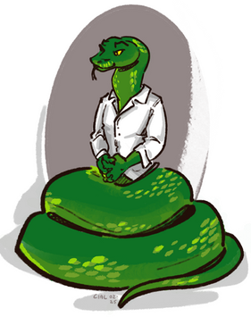 King cobra/boa constrictor type pal. uses she and he pronouns. Tries to be edgy and tough but is secretly a sweetheart.Related content