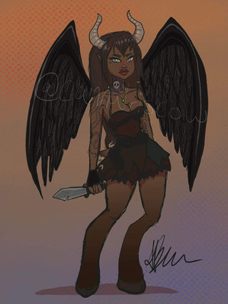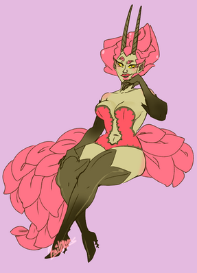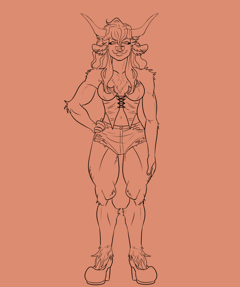[ID: a sketch of an anthropomorphic unicorn lady. She is red with dark brown hair and neon red horns and hooves. She is wearing a pale pink-gray leotard-like outfit with frills and bows as decoration. She is lounging with her eyes closed on a pale red background. She has two faces, with one eye shared between them, and two eyes on the other sides. Her hair and tail are braided.]