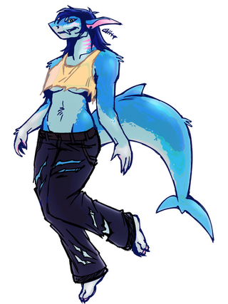 Just a lil design exercise. Love this concept a lot[Image description: A digital sketch of an anthropomorphic rat/shark lady. She has a shark tail and shark coloring while having a rat like snout and rat ears. Her hands are webbed. She wears a black bra and brown baggy pants. She has jagged black hair with the tips dyed neon blue.]