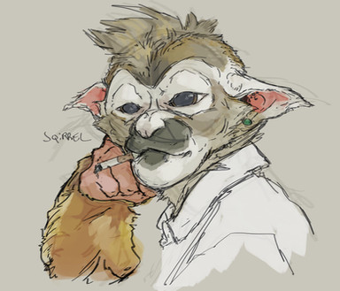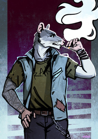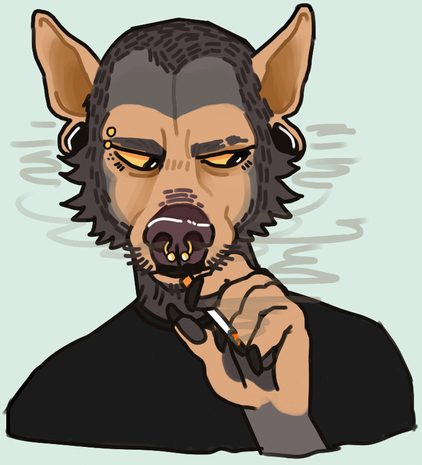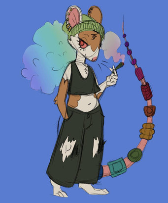 Just Wisconsin taking a smoke break.[image description: an anthropomorphic mouse leaning against a wall and smoking. They have light brown fur, are wearing a stained white tank top with brown pants, and yellow glasses.]
