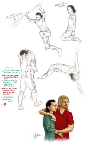 I love this idea, I just keep staring at it. I'm not usually someone who has a soft spot for villains (my weakness is usually geared towards anti-heroes, like say, Wolverine) but I do feel bad for Loki. Thor still loves him and refuses to let go or give up on him so he must know that his brother is in there somewhere who still loves Thor, is scared, trapped and needs his help, that, or Thor's just an idiot (though a lovable one.) There are times in The Avengers that his old self seems to come out, it's like he's saying how Thor was never his brother and how much he hates him but just for a moment, it's like there's a glimpse of a scared child, wanting his brother to save and comfort him, or how he asks Thor if his family mourned for him, like he just desperately wants to matter to someone.