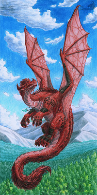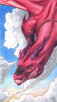 Exquisite detail that can stand up to close examination! The scales are just awesome and I am grumpy about scales most of the time- yours are not only drawn in detail from the mouth to the tail, but wonderfully shaded and textured, catching the light and looking like I can feel the shape of them. The construction is a good compromise between a Western Dragon and an Eastern Loong. Another time, you might put the clouds also beneath her, not just in the distance, unless you wanted the perspective to be somehow "symbolic"?