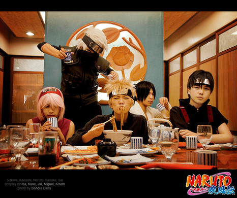 Wow! I like the colorful kanzashi in Sakura's hair. Sasuke looks kewl too. Aww, and I also enjoy seeing Naruto fuss over Sakura (love that couple). Please do a NaruSaku cosplay too