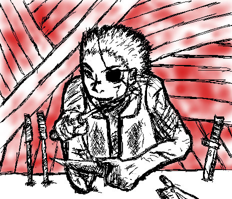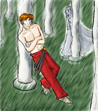 Tried something different with the coloring, obviously; skintones and lineart were done in painter, and the clothing patterns were added in photoshop. I rather like the effect, even if my inability to keep my lightsource consistent ruins some of the impact. I'm quite pleased with the way Kankurou came out- his foot, out of proportion though it may be, looks like a foot! With toes and everything! Excitement! His face was fun to color. Mmm, facepaint.