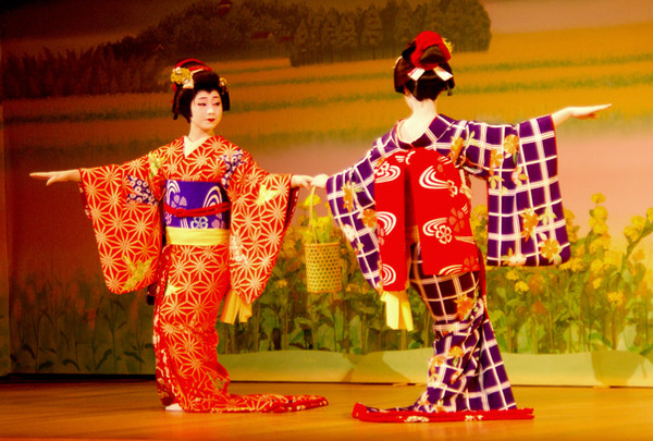 I love how you can see the differences between each Geiko's stance, how Tsuneyuu's turned in more and Masami's bending her knees more than the others. Even though they are dancing the same steps, they each have their own take on it. It's a great shot.