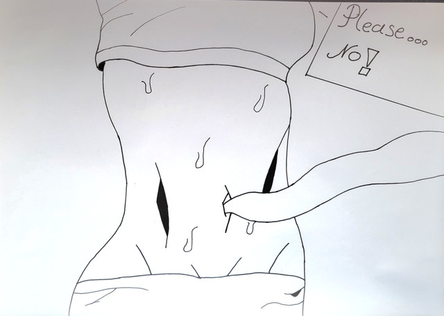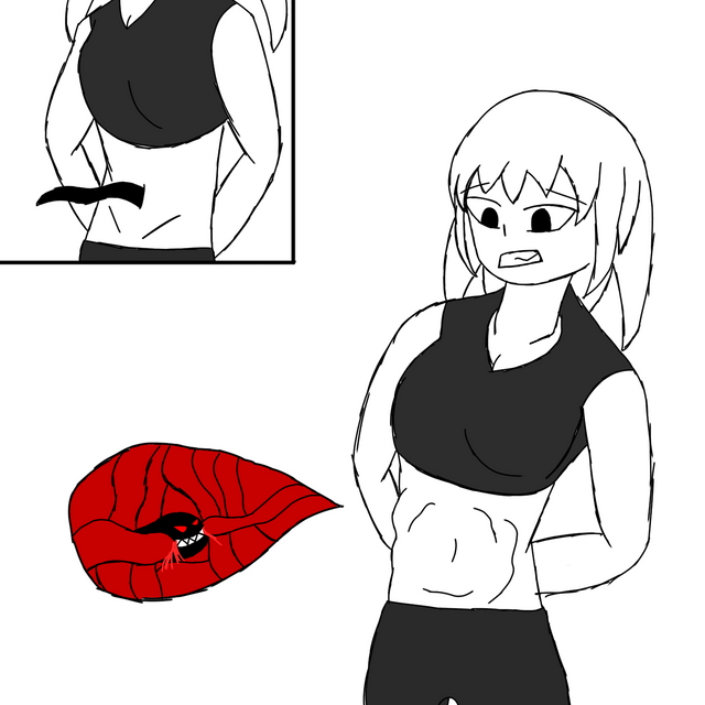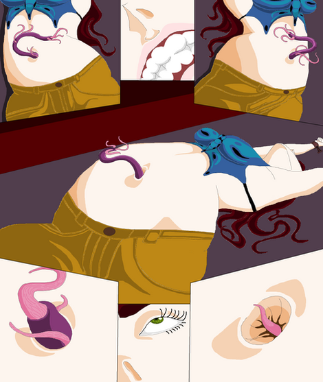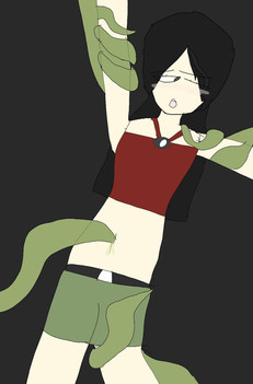 She felt a stab in the back over her belly button. Groaning, she arched her back. Something inside the worm-like tentacle crawled out and pushed itself through the cut in her navel crease and into her. She gasp in surprise and bewilderment. It only hurt for a split second and suddenly and felt so good. A warm sensation spread throughout her belly, making her feel relaxed and calm. She gave up resisting.