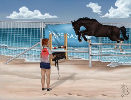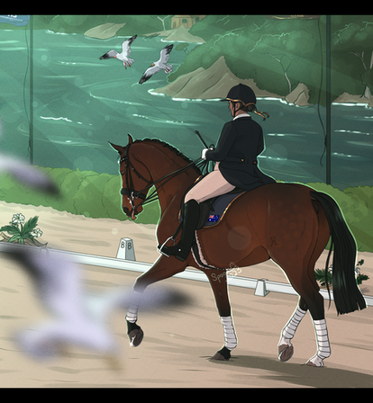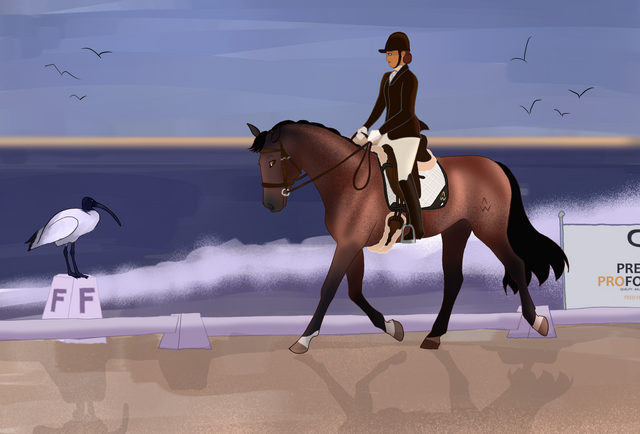 Nonetheless Bailey sat watching test after test of other competitors. The sun quickly wanting to sink into the ocean. Around 5 PM Bailey was informed she’d be called soon. She head to get Cino and warmed him up, the test was just walk and trot thankfully. Soon after being comfortable atop her mount she was called into the arena. The tide was low and receding fast. The sky turning pastel. Their reflection beaming off the sand. Then the two began their dance.