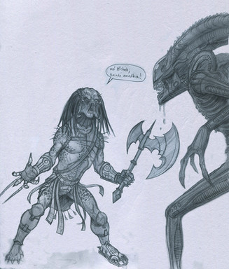 Hi there.I wanted to draw some human/Predator Team up, and I wanted to draw Hate Predator-so here is the team up. The human/soldier/mercenary has a prostetic left arm.