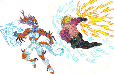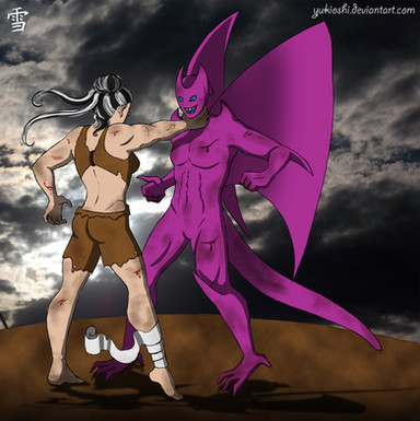 Hi there.My OC Saiyan in his unique "partial legendary" transformation vs some mercenary/assasin female from unknown species.