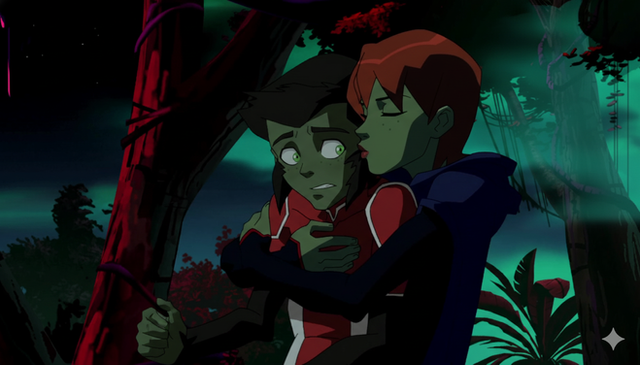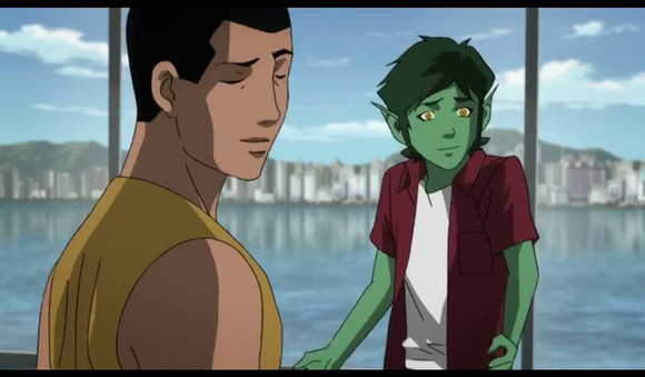 This is a screenshot from Young Justice but I'm including it in my Teen Titans gallery. This show gave me ideas for some of my fanfictions. For example, I put Miss Martian in a few chapters of a Teen Titans fanfiction I'm working on now. I'm not crazy about his origin story in this series but I do like the relationship between Beast Boy and Miss Martian in this series. That's why in my story I am having them be good friends and Miss Martian does sort of see him as the little brother she never had, and also Beast Boy was the first one who met her, befriended her, and got her into the Titans. Also in my story, personality wise Miss Martian is like a combination between Beast Boy and Starfire, she is very cheerful, sweet, and brave, but sometimes she's a little like Raven, being mysterious and misunderstood. Hope you like it.Related content