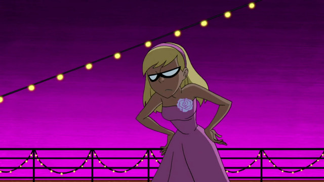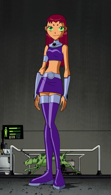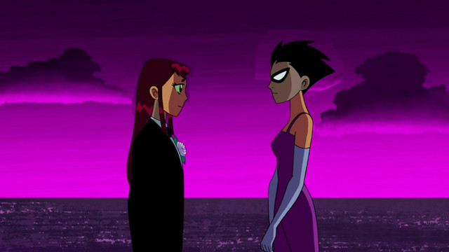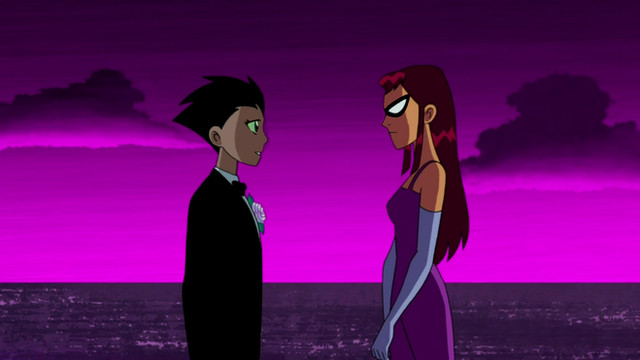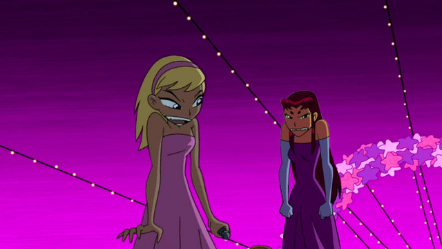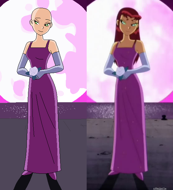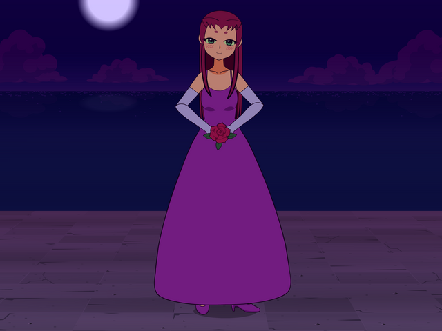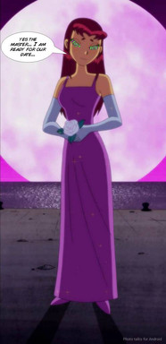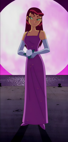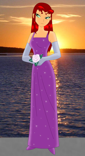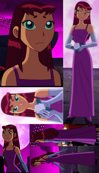 I know tons of people have posted this image of Starfire online, but I wanted to do it anyway. I also edited her face a little bit to make it different, and it does sort of suit the idea. They're going to a party and Starfire is Robin's date. He's definitely got a winner, he's a lucky guy. I feel if they made another season they should've had a moment like this between Beast Boy and Raven, only it would be the other way around. Like maybe they're going to a party undercover and they dress formally. Raven's waiting for Beast Boy, looking fetching in her formal blue dress, and she's expecting him to look ridiculous or to not look any different. But then he shows up looking sharp in a tuxedo, he even combed his hair. Simply put, he cleans up nicely. But this was still a great moment, and I'm sure Robin's heart was pounding when he saw Starfire in this dress.Related content