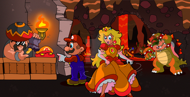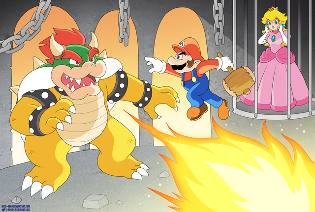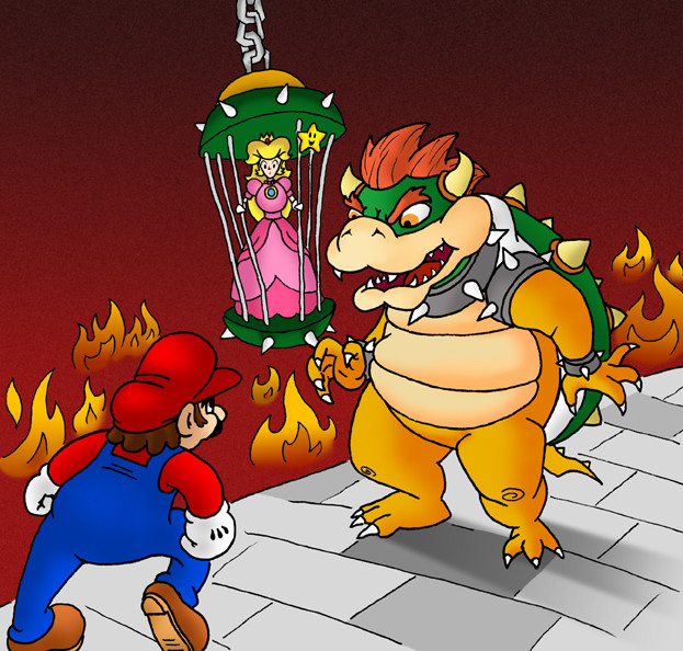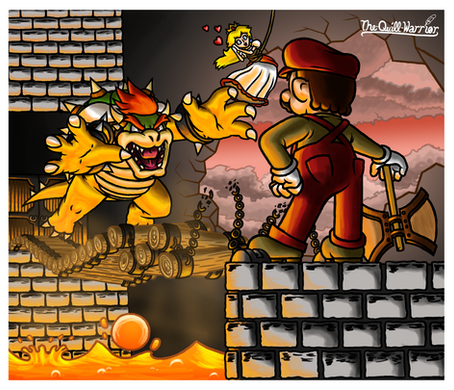 I am old school and I will remain that way forever! BWA HAHAHAHA!Anyway, Mario (in his original poop brown shirt and red overalls) vs. Bowser on a bridge over lava with a giant bridge destroying button just laying around...