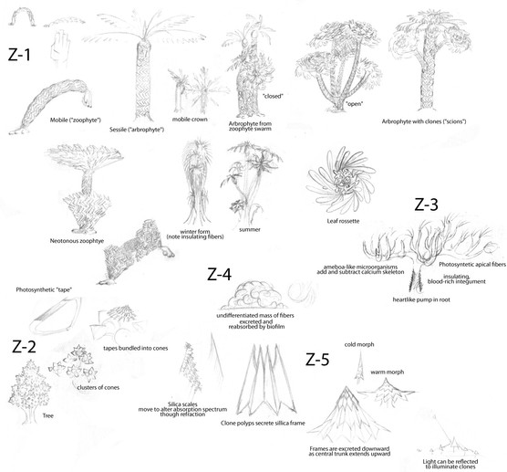 Z-2: (tape tree zone). The rigid, metallic "skeleton" of the Z-2 macrofauna runs in a helix shape between the internal organs and the outer cuticle. Hard claws on the bottom edge of the helix grip the soil, and the animal moves by contracting and relaxing the helix in waves. For faster movement, they can stand on their tails, compress the entire helix at once, then launch themselves into the air by spring action. (don't ask me what they breathe, since the plants on their home-world consume oxygen)
