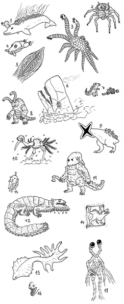 Z-7: (deathray moss zone) Though superficially similar to giant insects, these animals have more in common with the growth patterns of echinoderms, described by one observer as "basically a stack of sea-urchins." There is also evidence to suggest that these creatures left their ancestral ocean as fliers (perhaps at a time when their planet was flooded), and only later colonized the land.