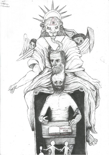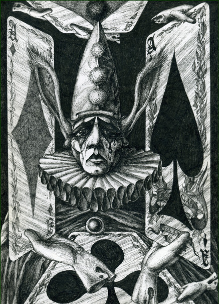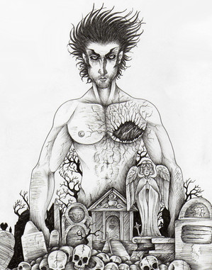 This such an amazing concept! I could look at it for hours. I especially love the small creatures in the borders, and how certain areas of the large figure (Death, I assume) are cut away to reveal his insides.