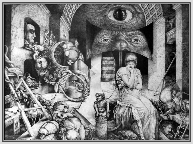 Wow, man this is out there. Damn it even looks good when you maximize it. Okay I see the cycle along the border. It's intriguing the use of the hybrid fish people along the top row. It's bibical almost. The woman with the three faces and the crown send out something powerful. The symbolism there I can't figure but it stir up something deep. Boy there even on the building. I think work goes the deepest with me as far as what I seen on deviant. I tend to think about death quit often because it makes me appreciate the time I have. This piece is alcehemy whether you intended it or not. Those weird creatures and the accompaning eyes speak to my sub regions. Well if you haven't figured it out by now I really dig this. I'd be really honored if you could quickly browse my gallery. Thank you.