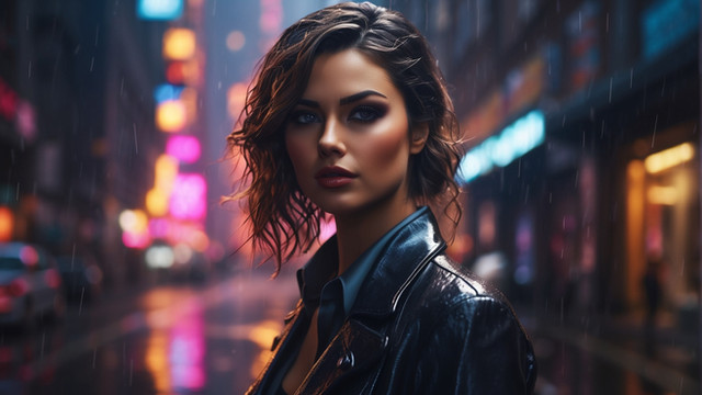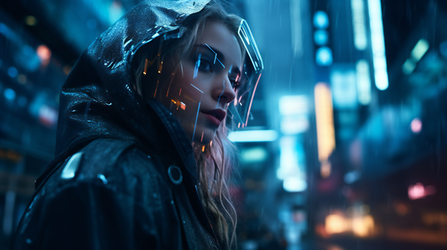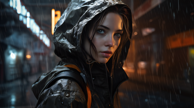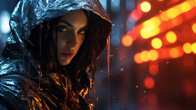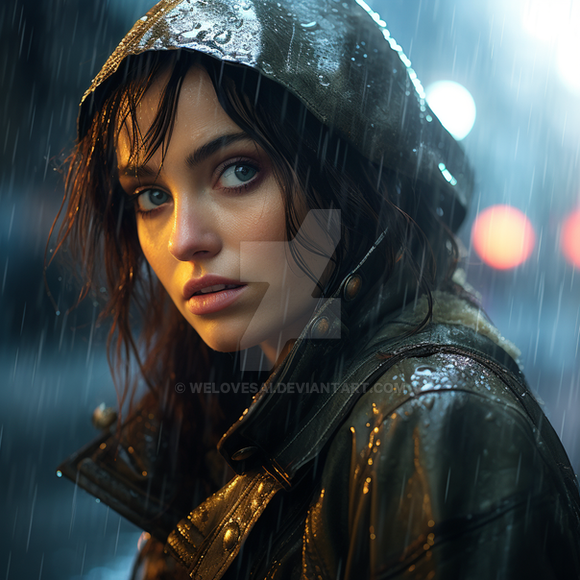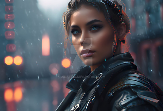 #ai #beuty #coat #cold #cyberpunk #evening #future #hood #neon #rain #storm #traffic #beautifulgirl #citylights #cityscape #futuristic #meeting #realistic #texture